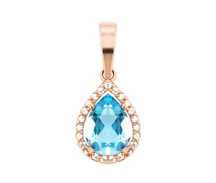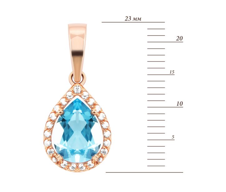 Изделие выполнено из красного золота 585 пробы. Вес подвески – 1,45 г, длина – 23 мм. Крапановая закрепка и паве обеспечивают надежное удержание камней и подчеркивают их природную игру света. Контраст теплого золота и холодного сияния топаза делает украшение универсальным – оно одинаково гармонично смотрится и в повседневном образе, и в праздничном ансамбле.