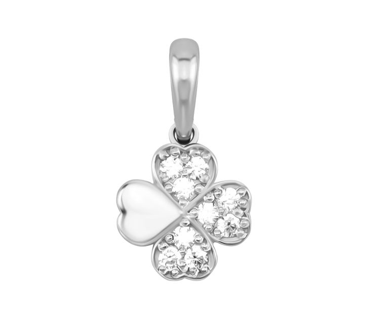 Витончена підвіска у формі конюшини з білого золота 585 проби втілює символ удачі та сучасну елегантність. Родієве покриття підсилює холодний блиск металу, а розсип білих фіанітів у закріпці паве створює м’яке, рівномірне сяйво, яке приваблює погляди.